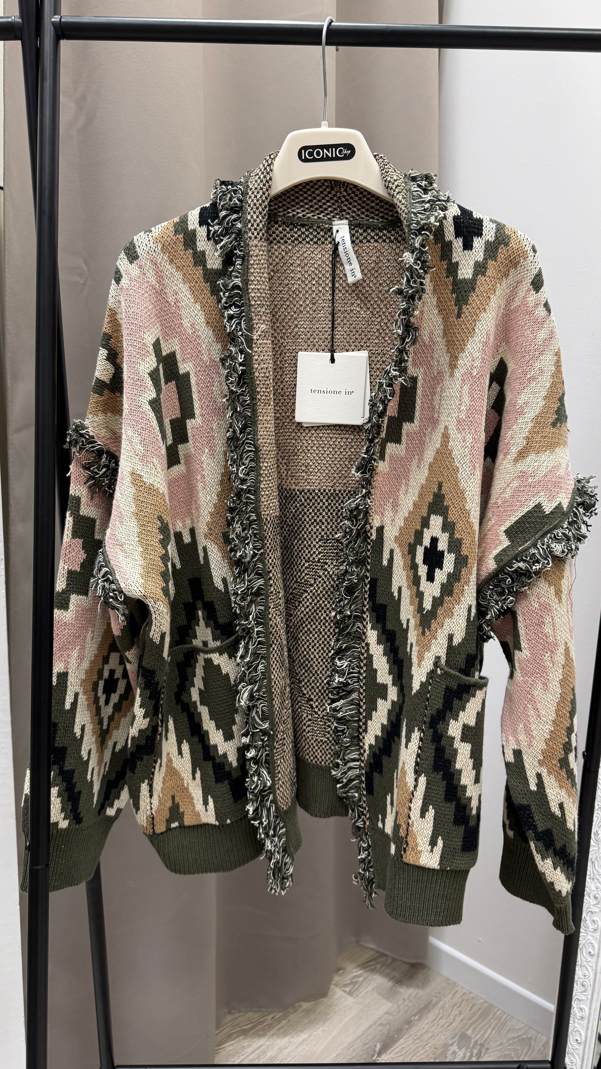 Cardigan Caban in fantasia etnica Con frange e tasche frontali nei toni del moro giallo, biscotto e burro