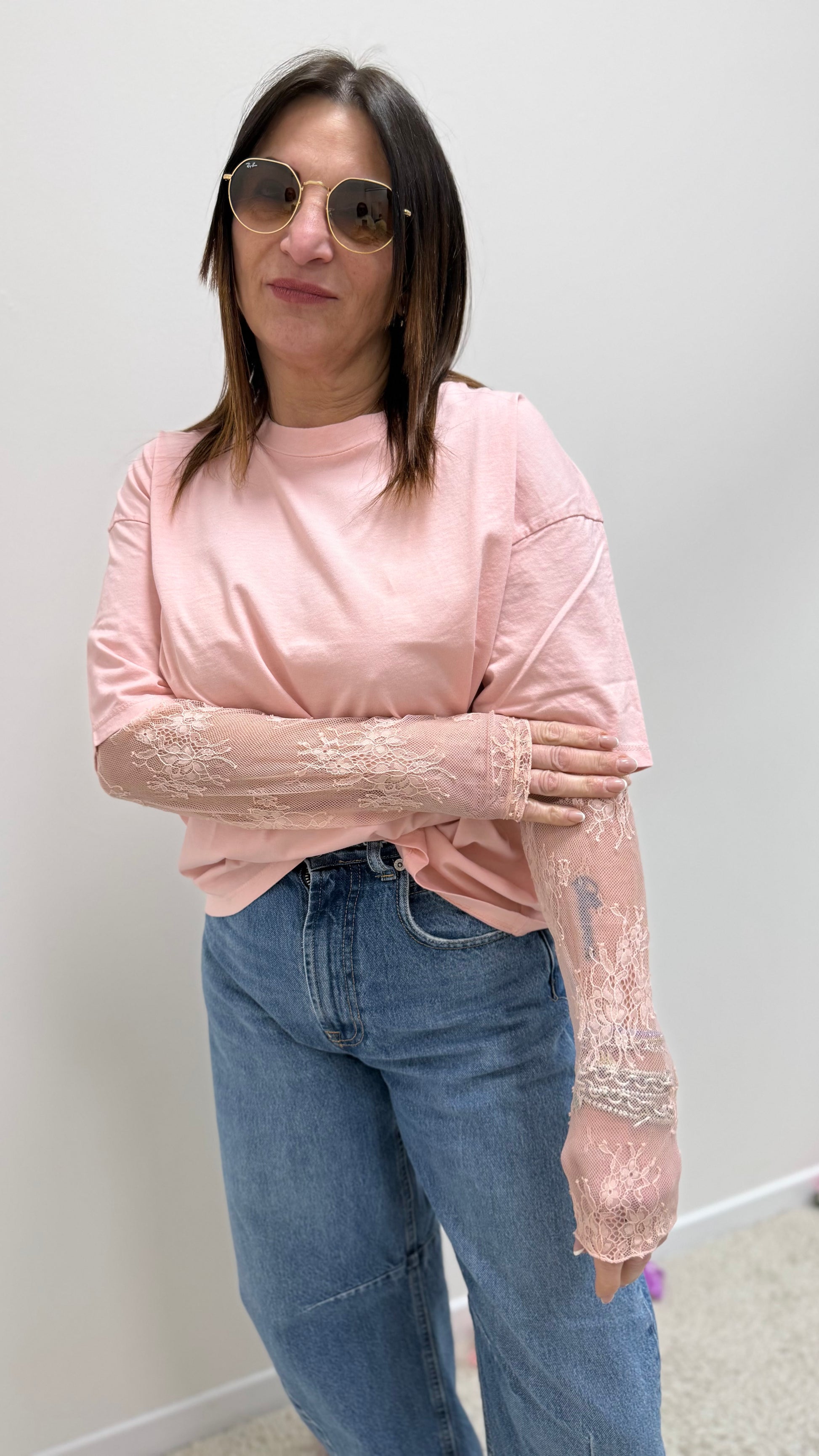 T-Shirt con manica in pizzo Susy Mix in cotone paricollo taglia unica vestibilità regolare rosa