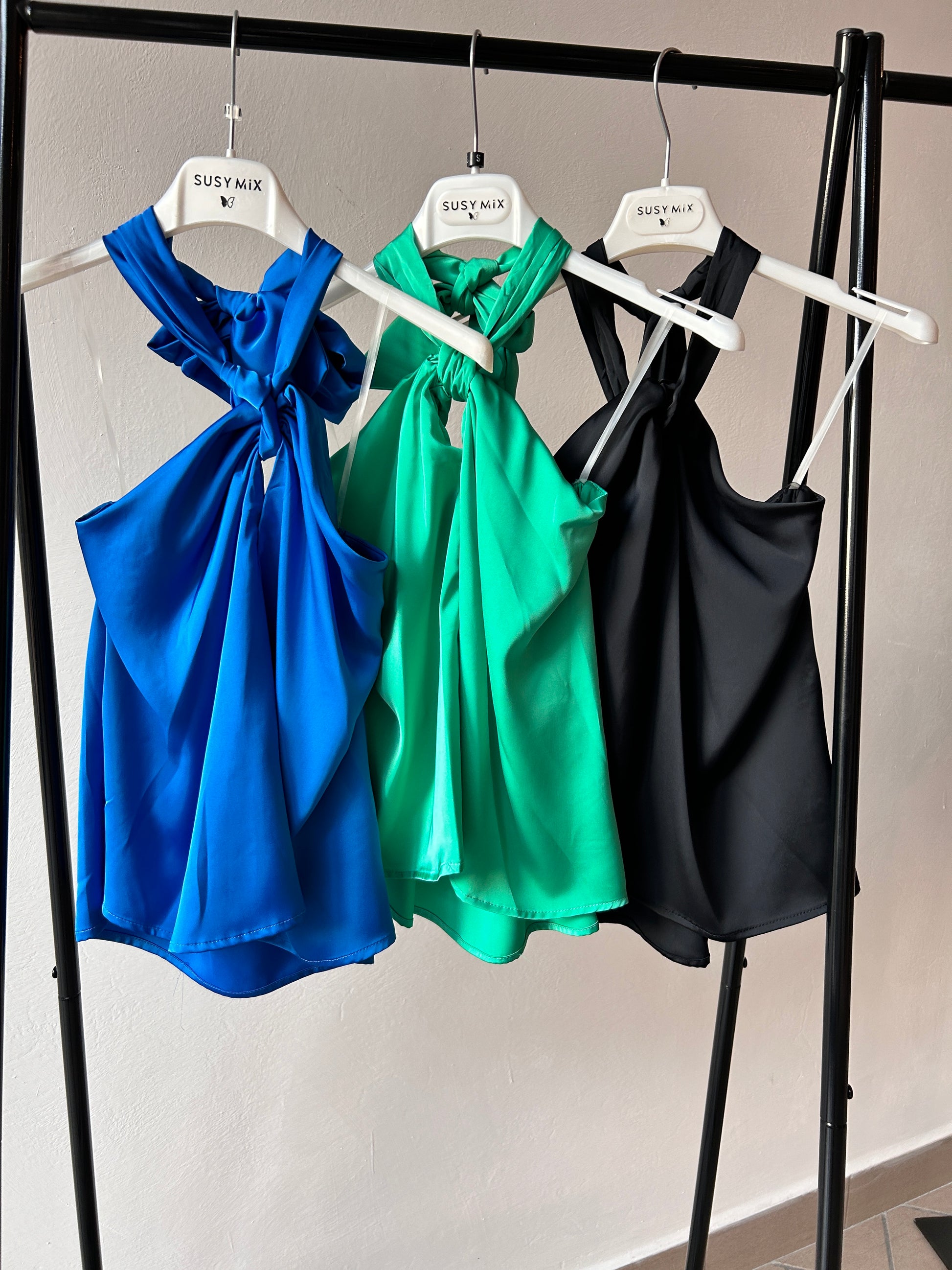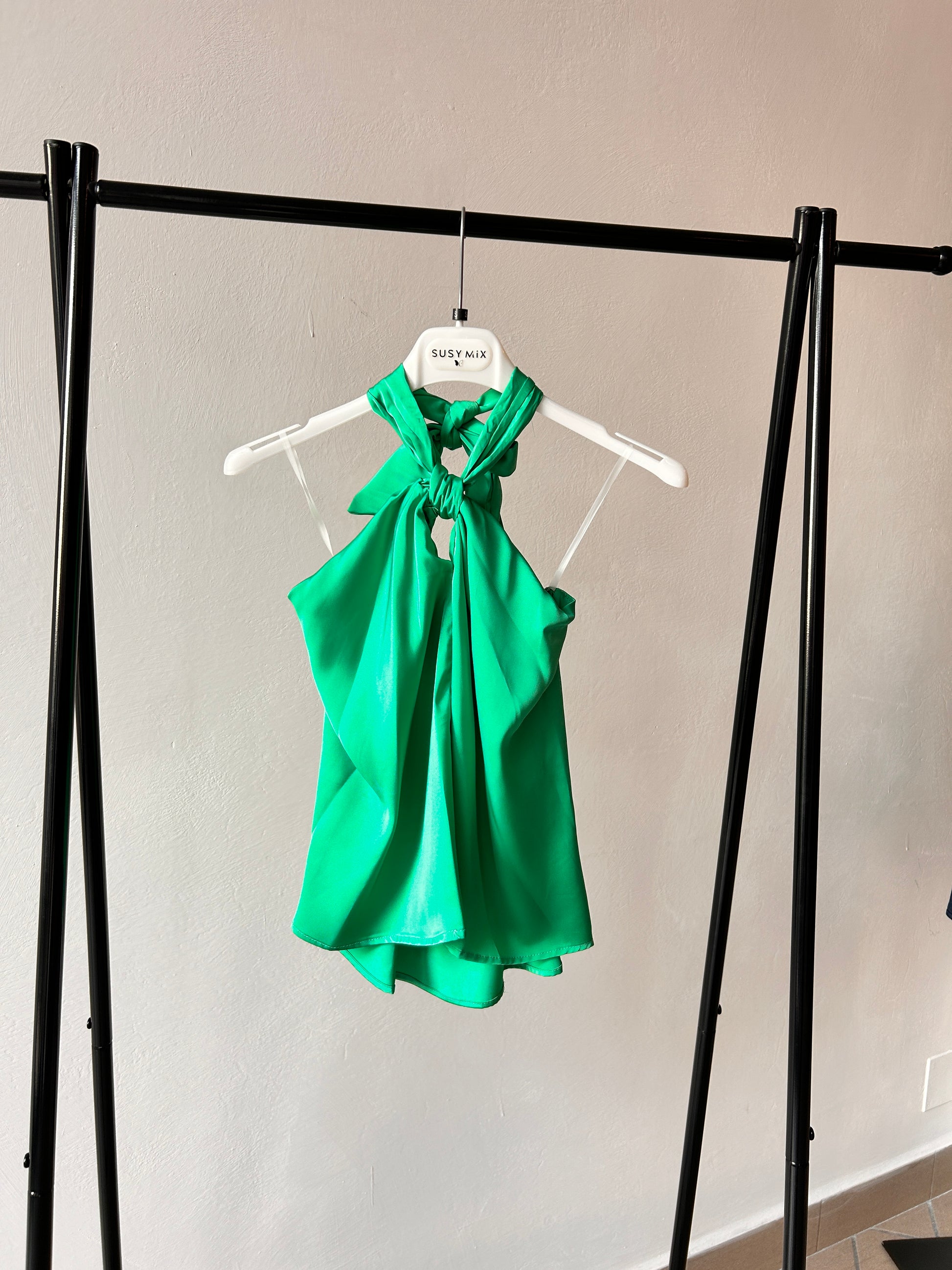 Viscose top with knot on the breast to tie behind the neck.