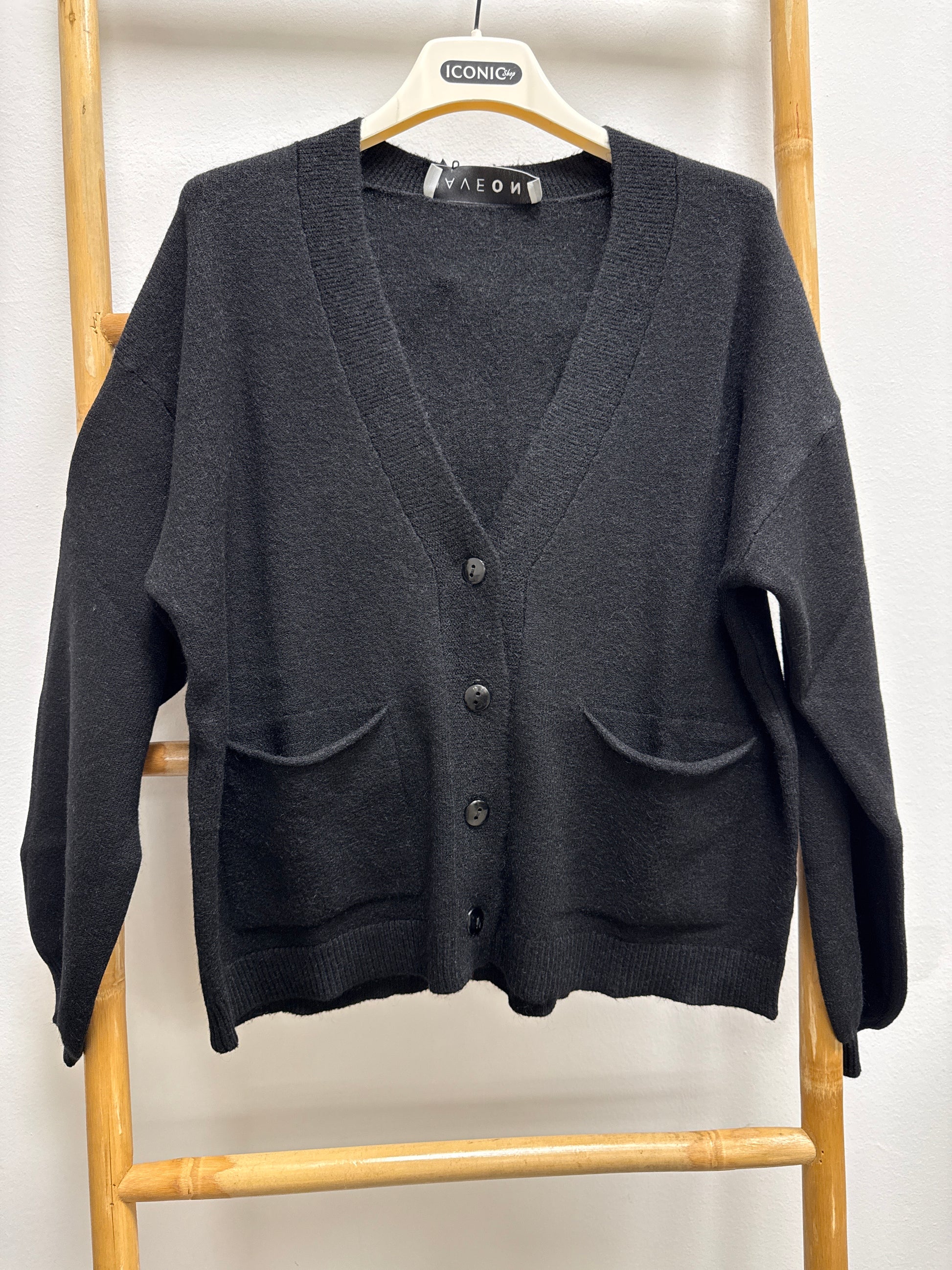 Cardigan dritto nero viscosa rasata con taschine Haveone