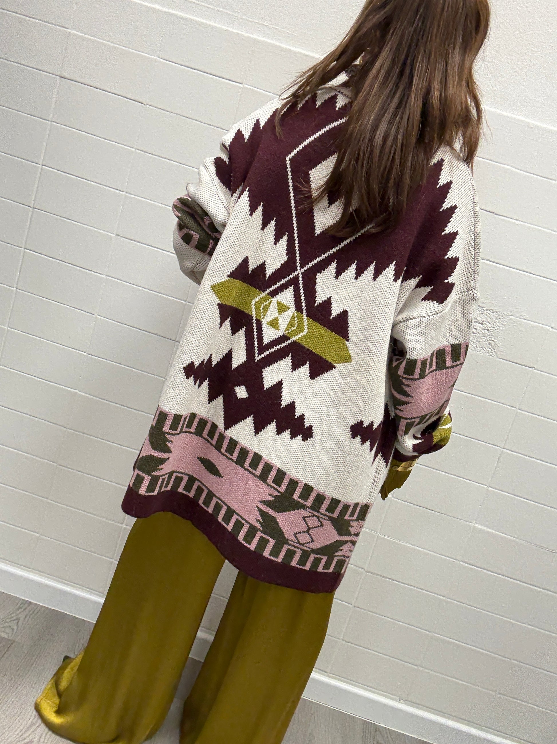 Cardigan cappotto Lungo in maglia pesante in fantasia etnica.