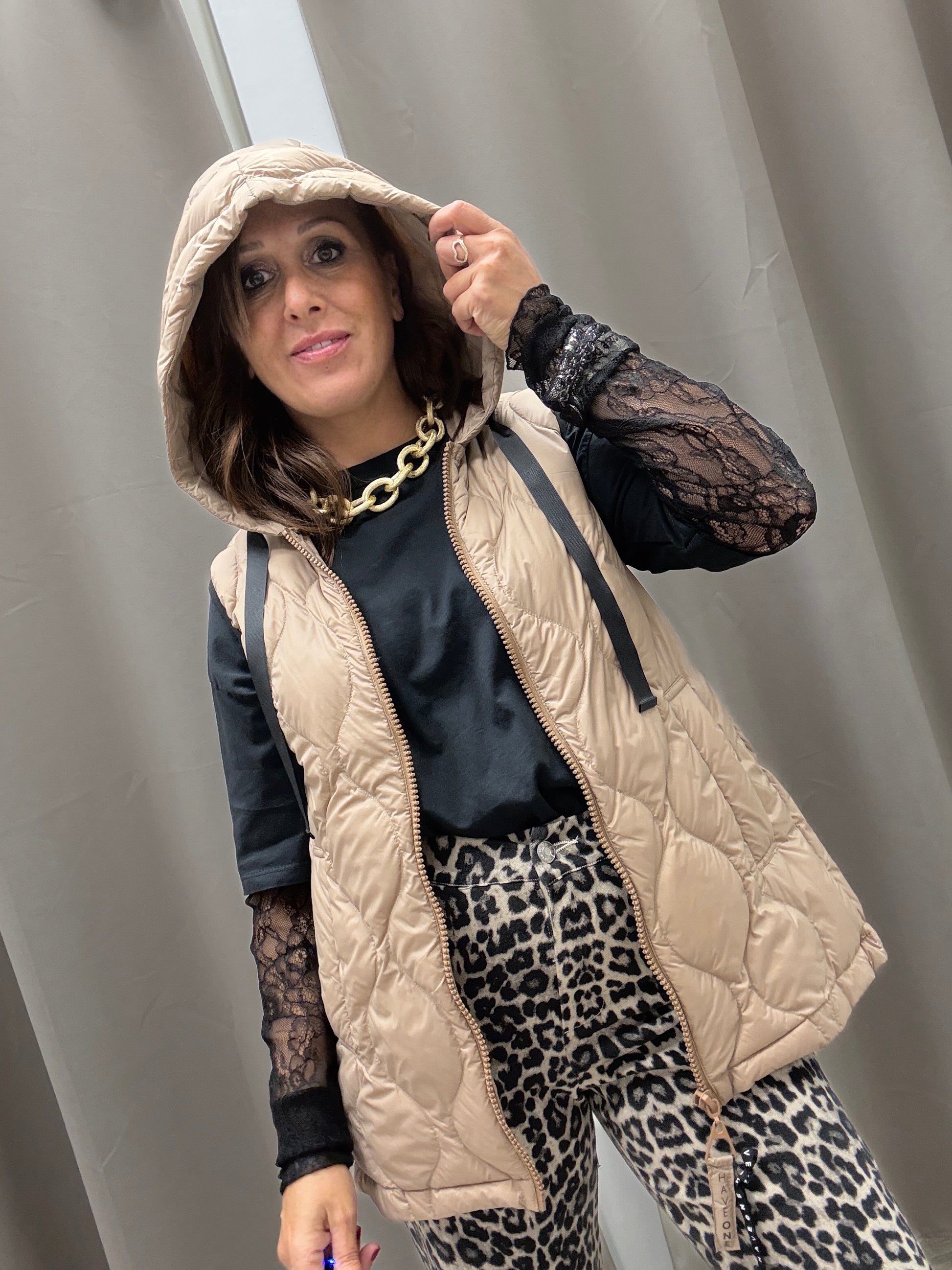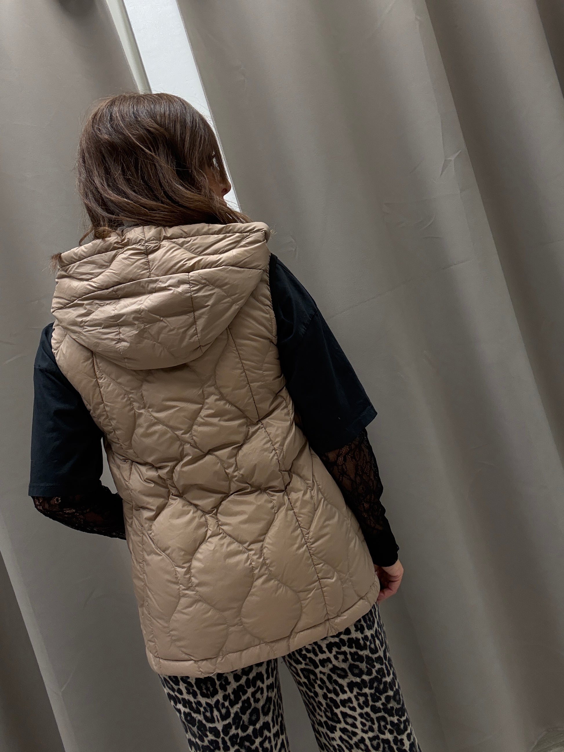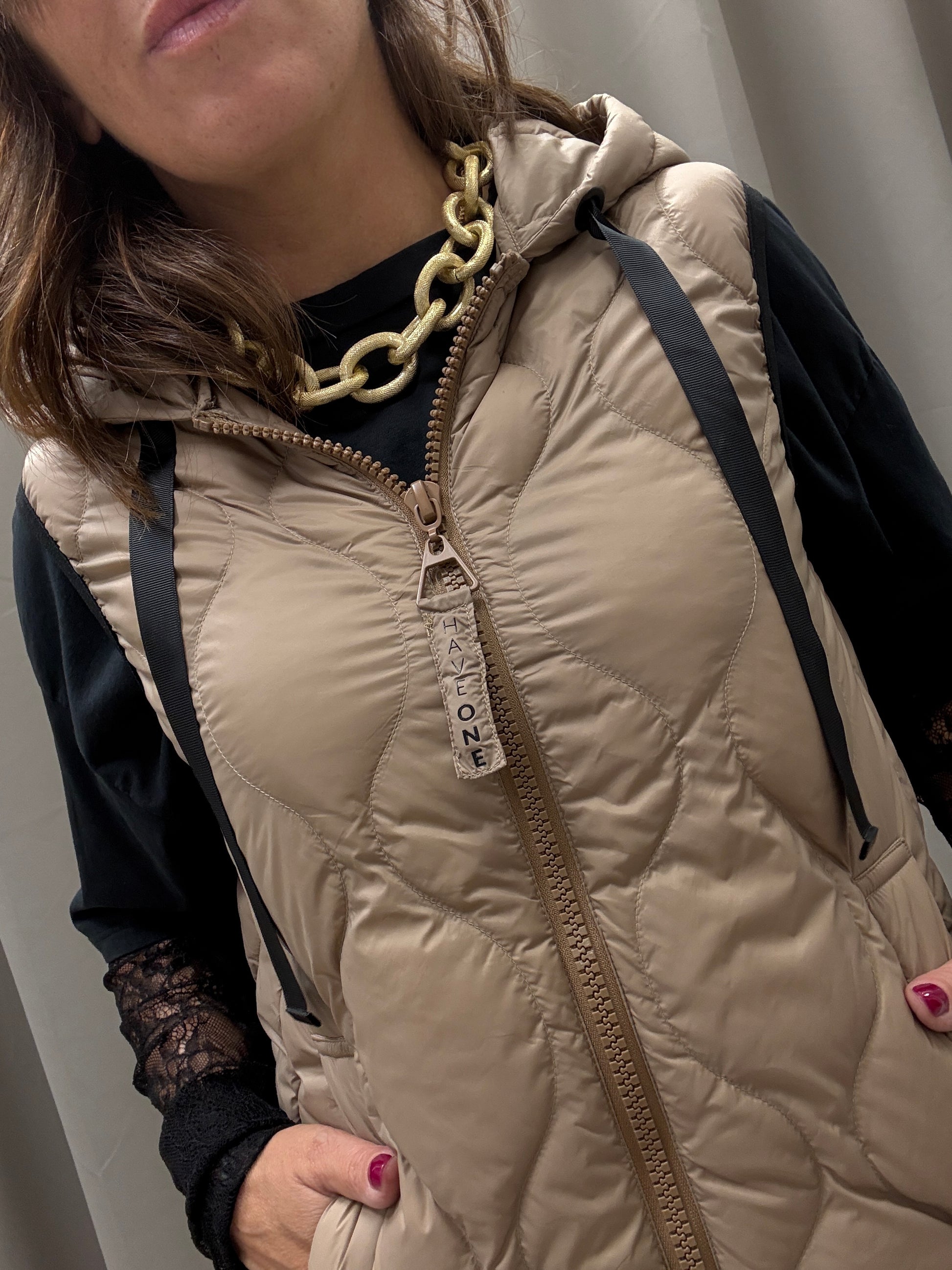 Piumino smanicato con cappuccio HaveOne trapuntato chiusura centrale con cerniera modello dritto
