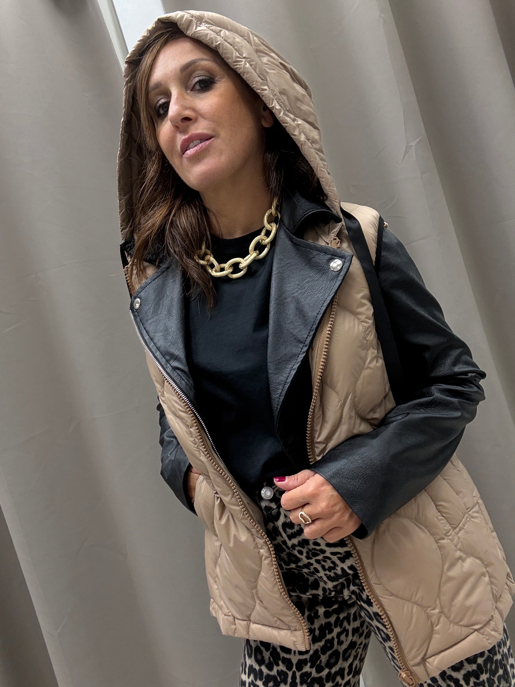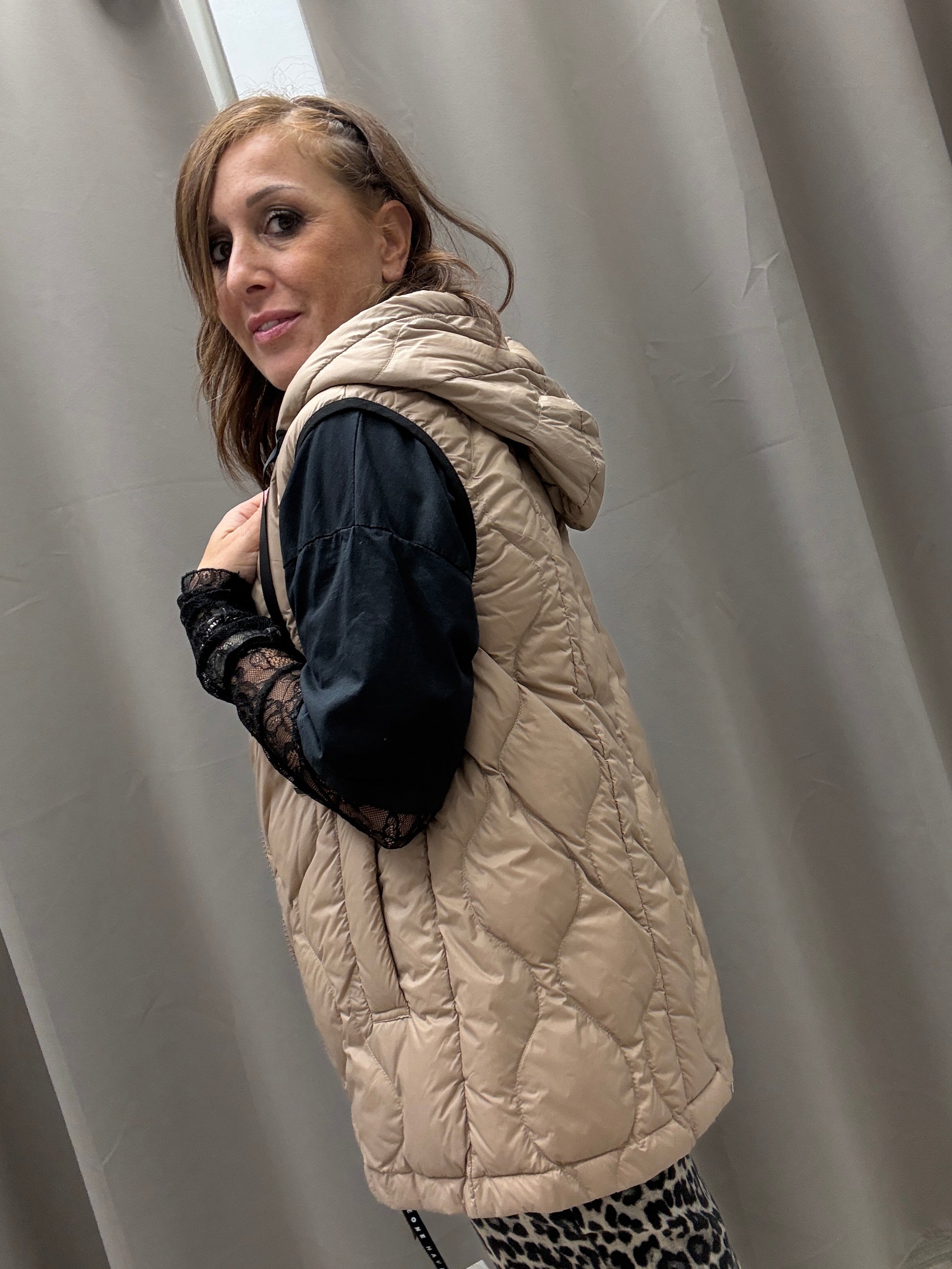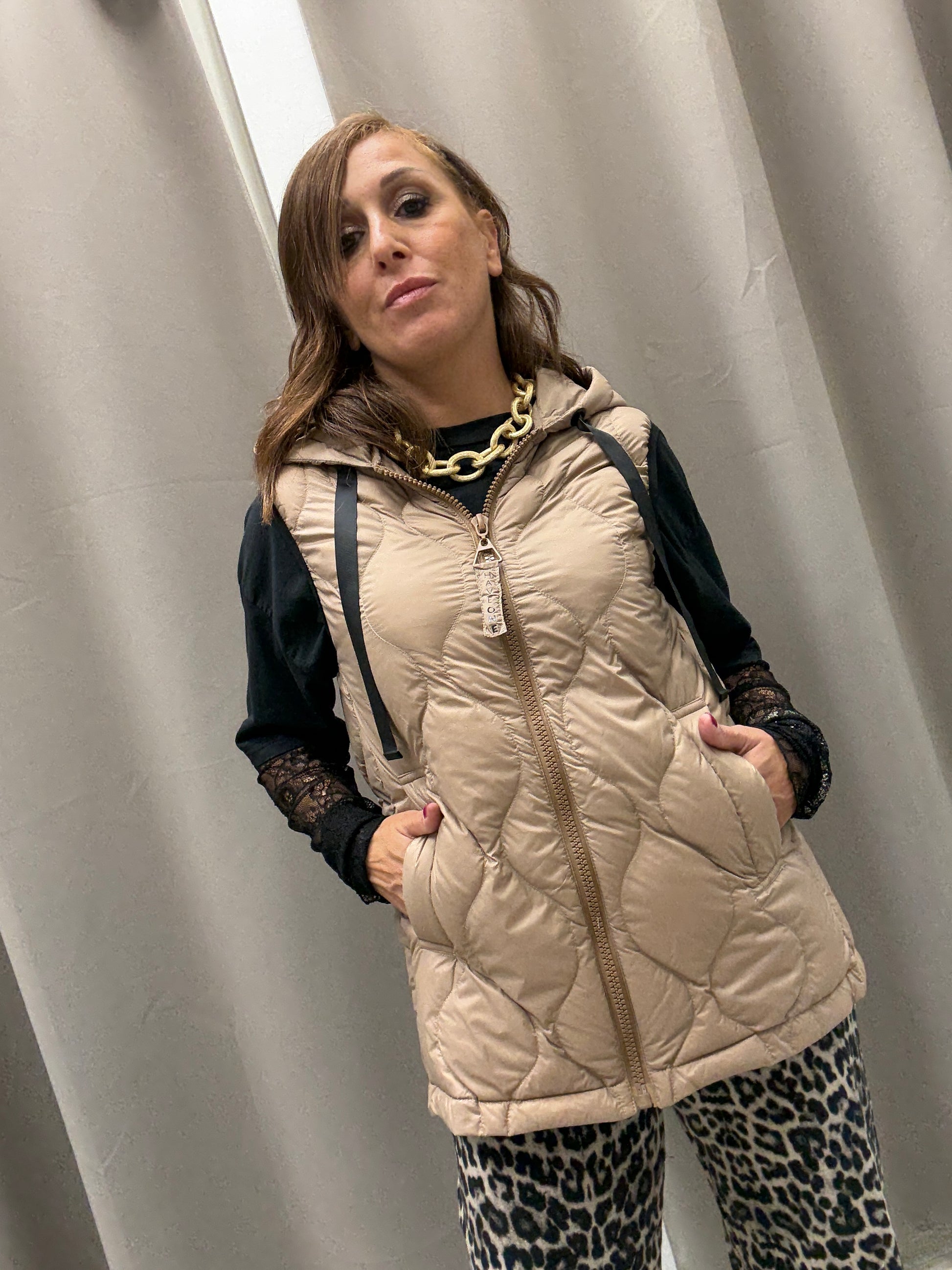 Piumino smanicato con cappuccio HaveOne trapuntato chiusura centrale con cerniera modello dritto