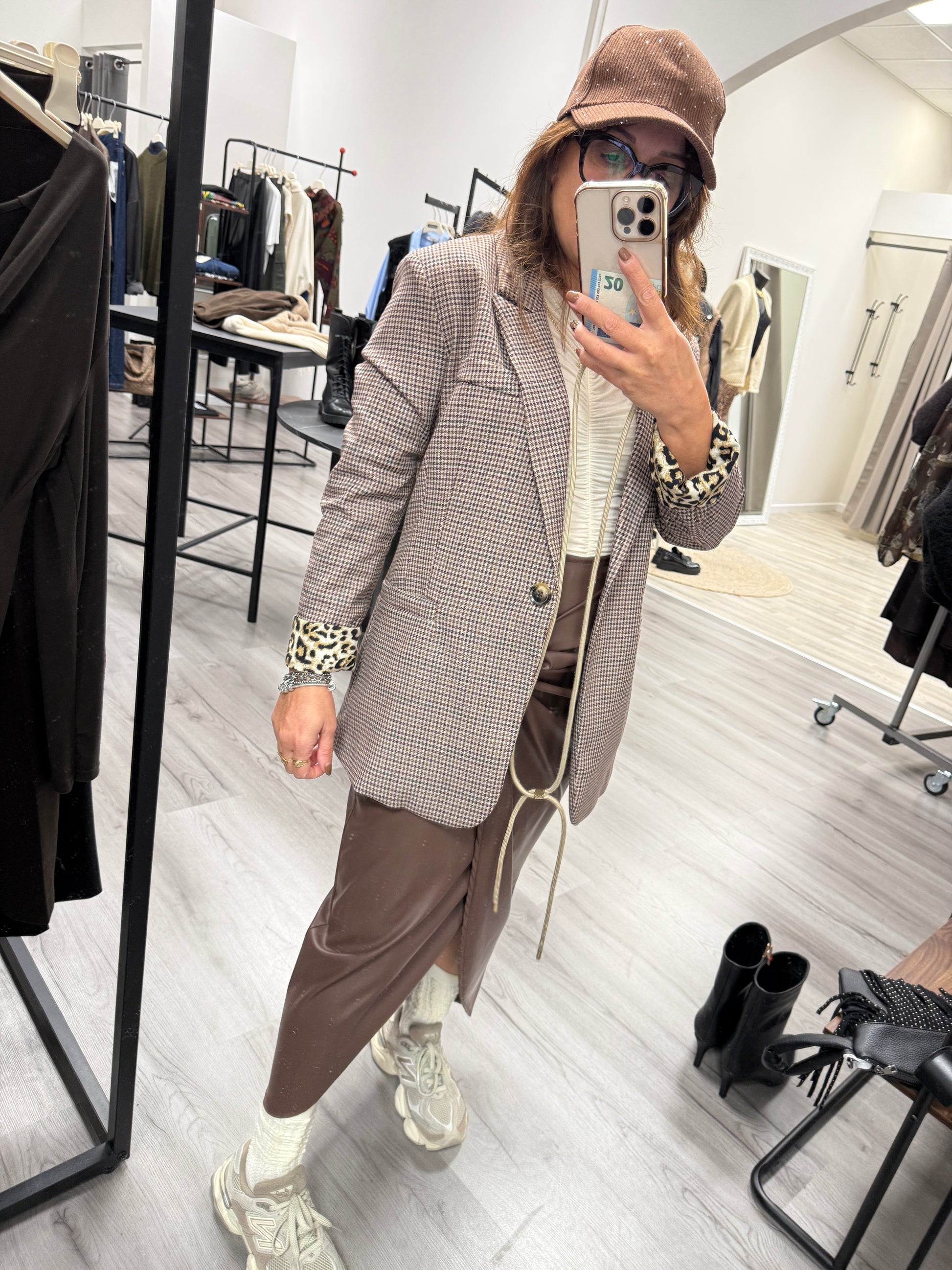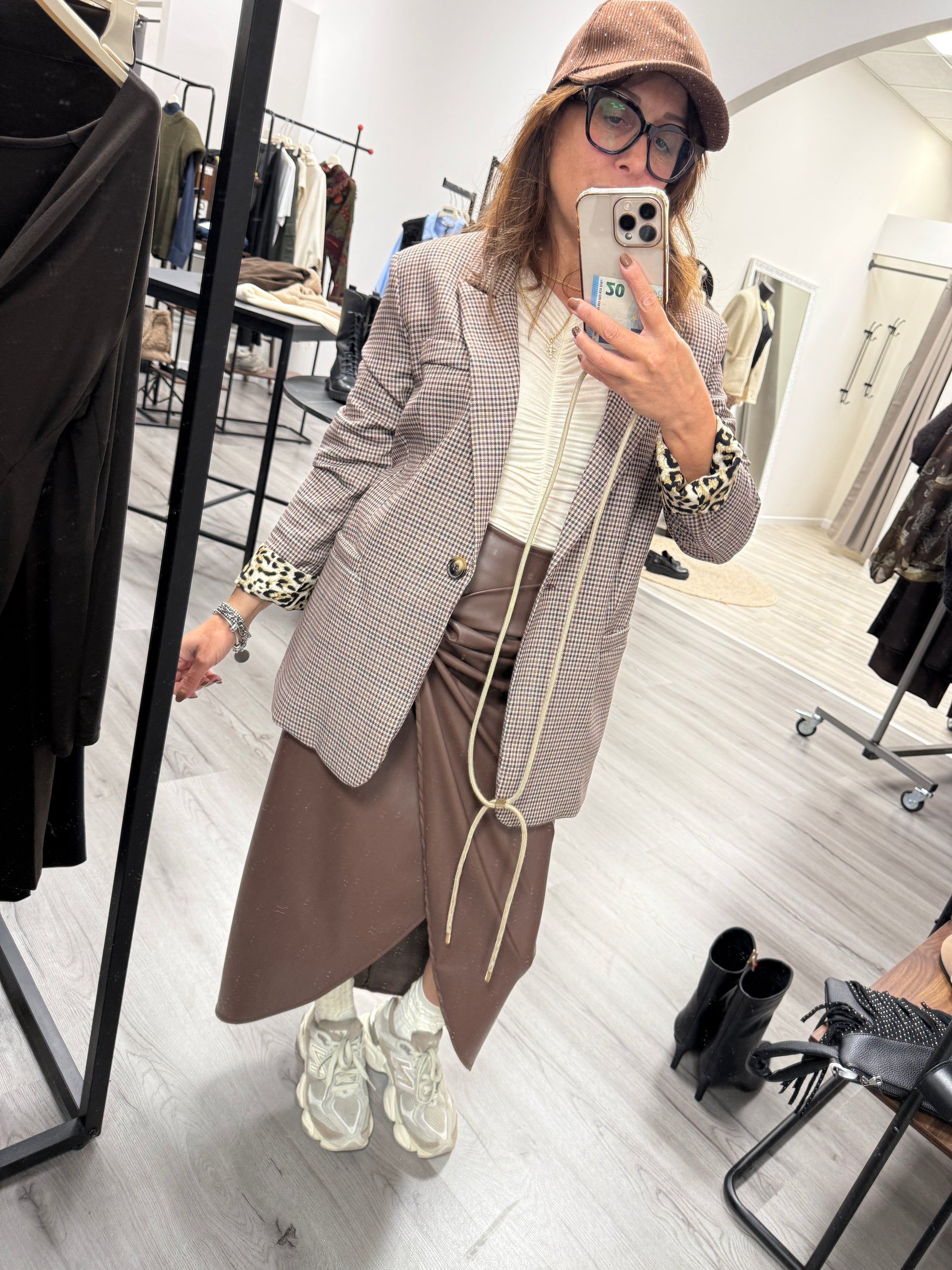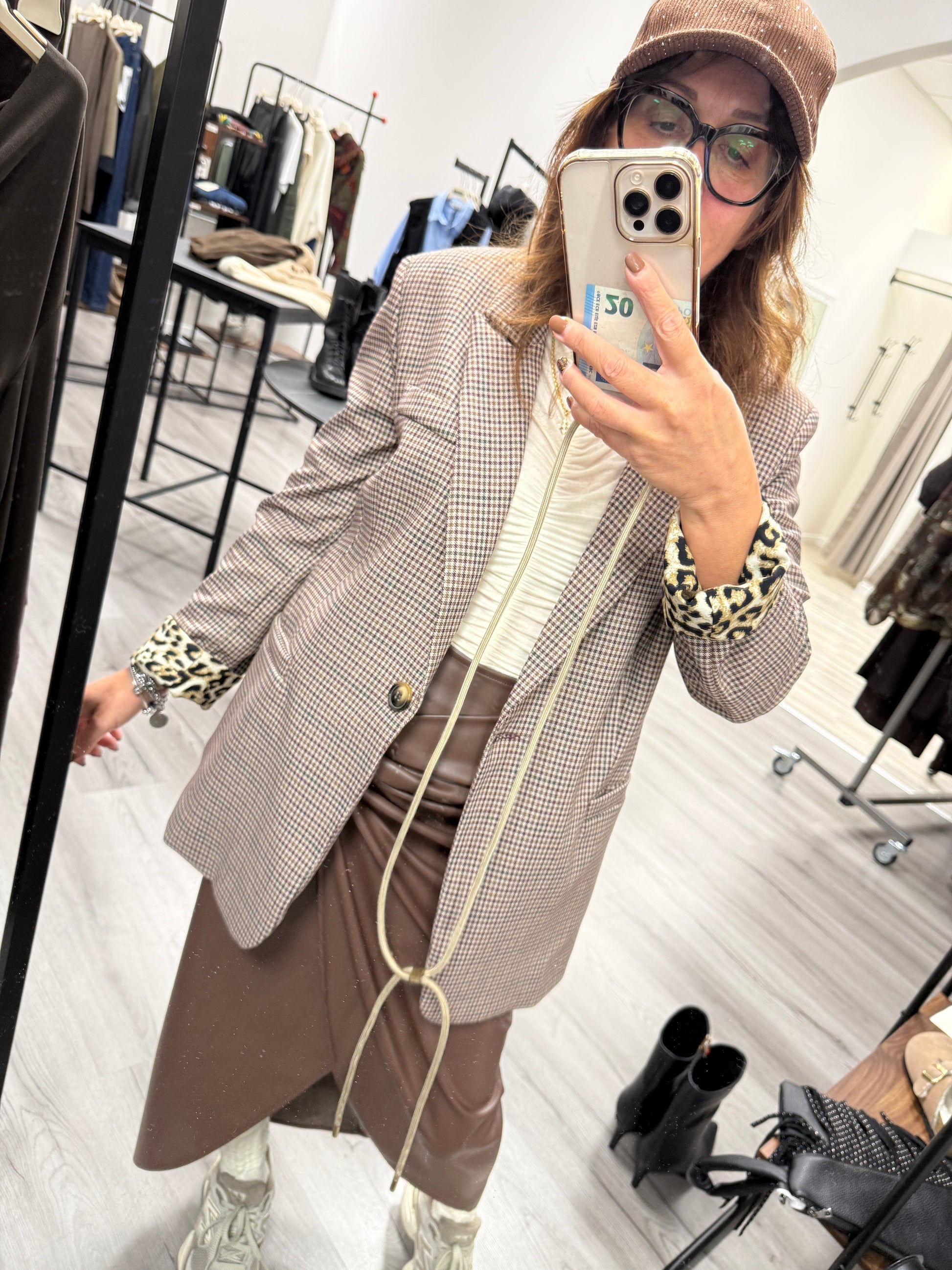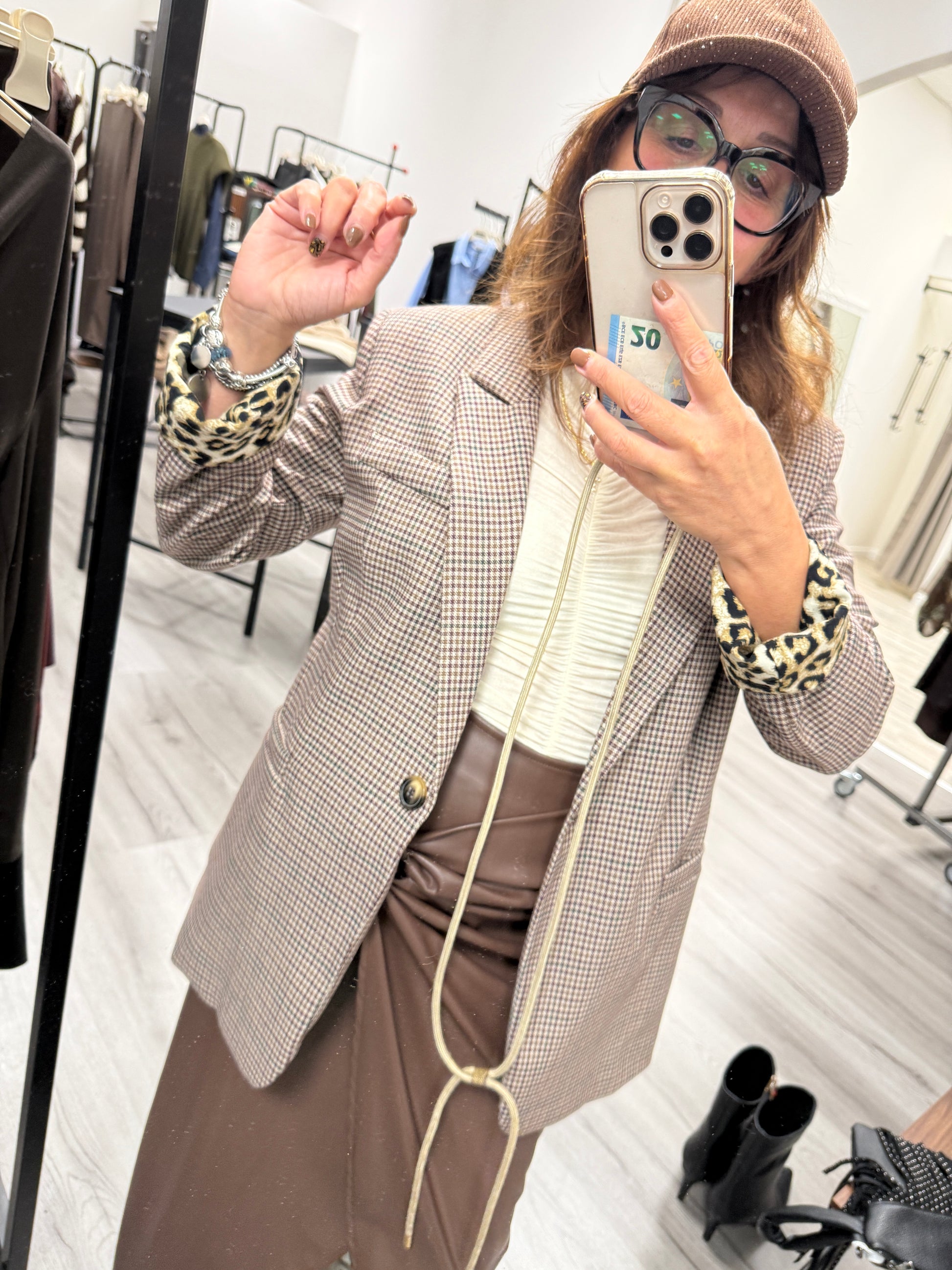 Giacca blazer in fantasia Shack con toni che vanno dal vino moro, tabacco verde, bosco e burro Con interno fodera maculata.