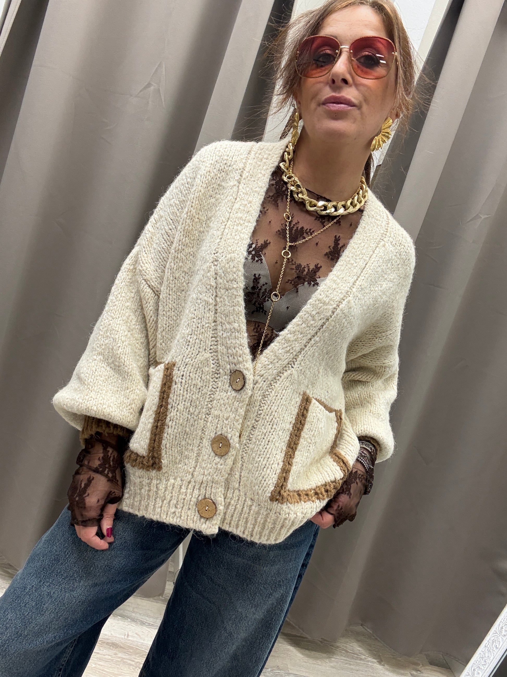 Cardigan tre bottoni burro HaveOne scollo a V applicazione di tasche sul davanti rifiniture e polsini color cammello