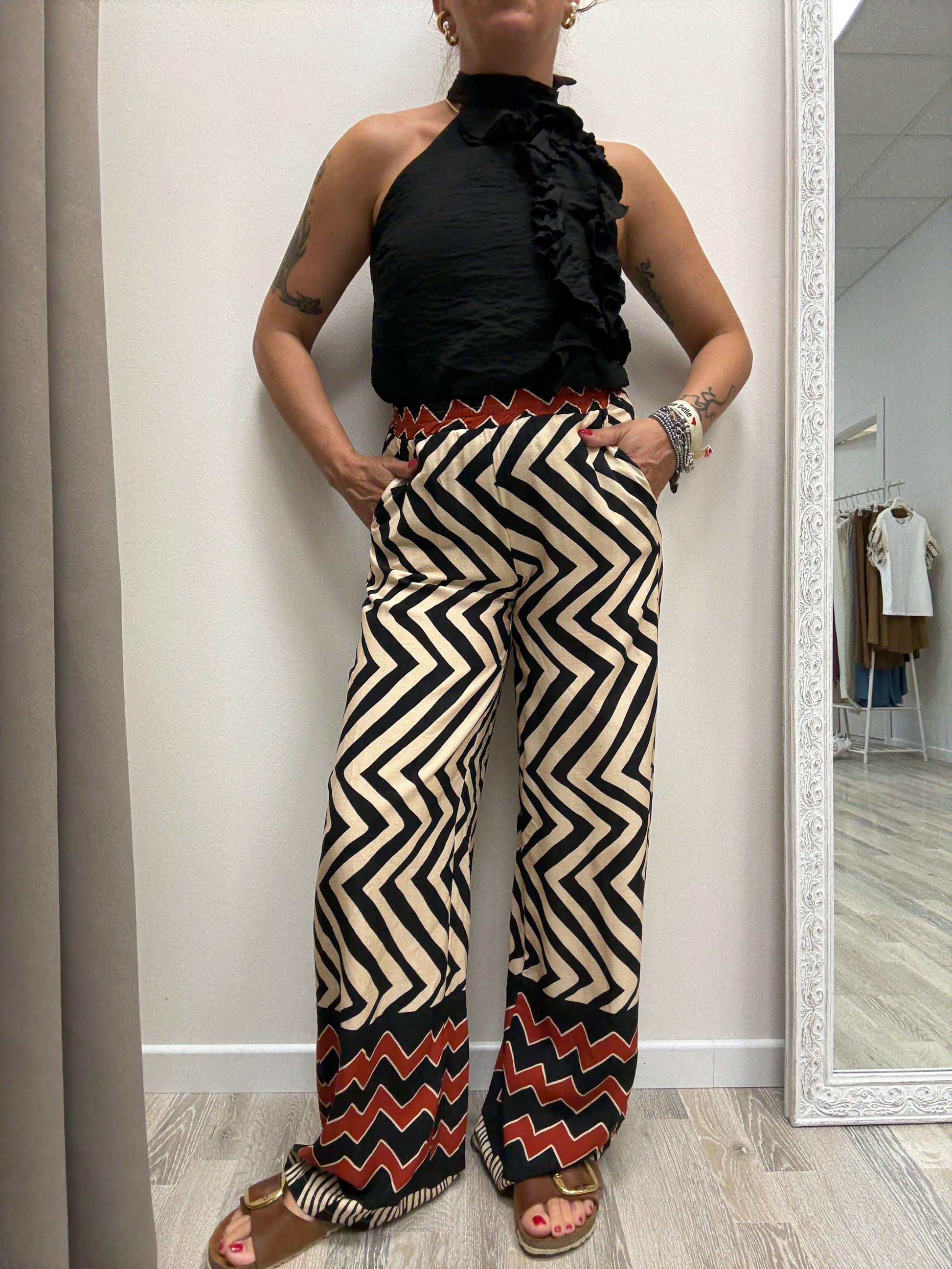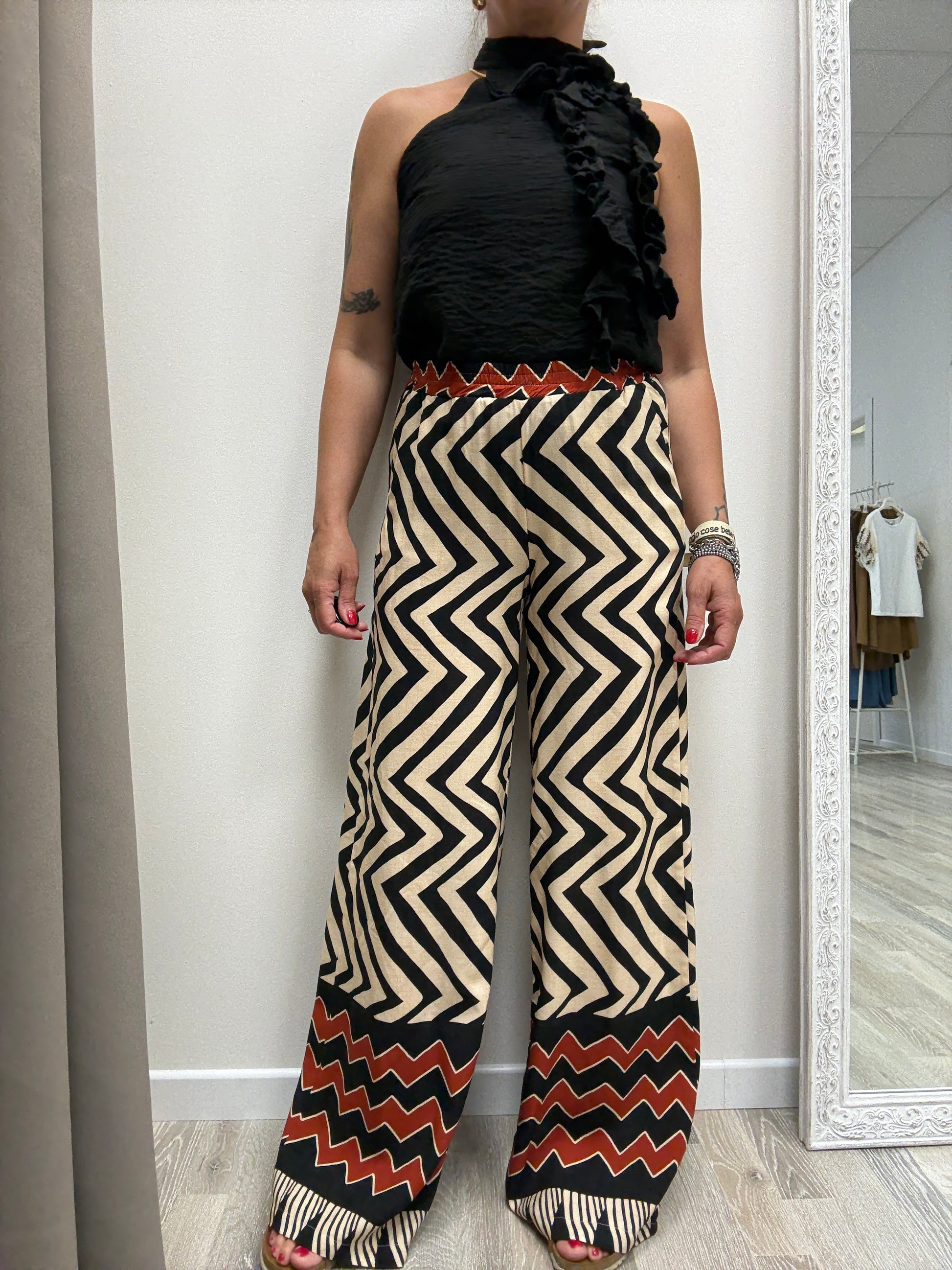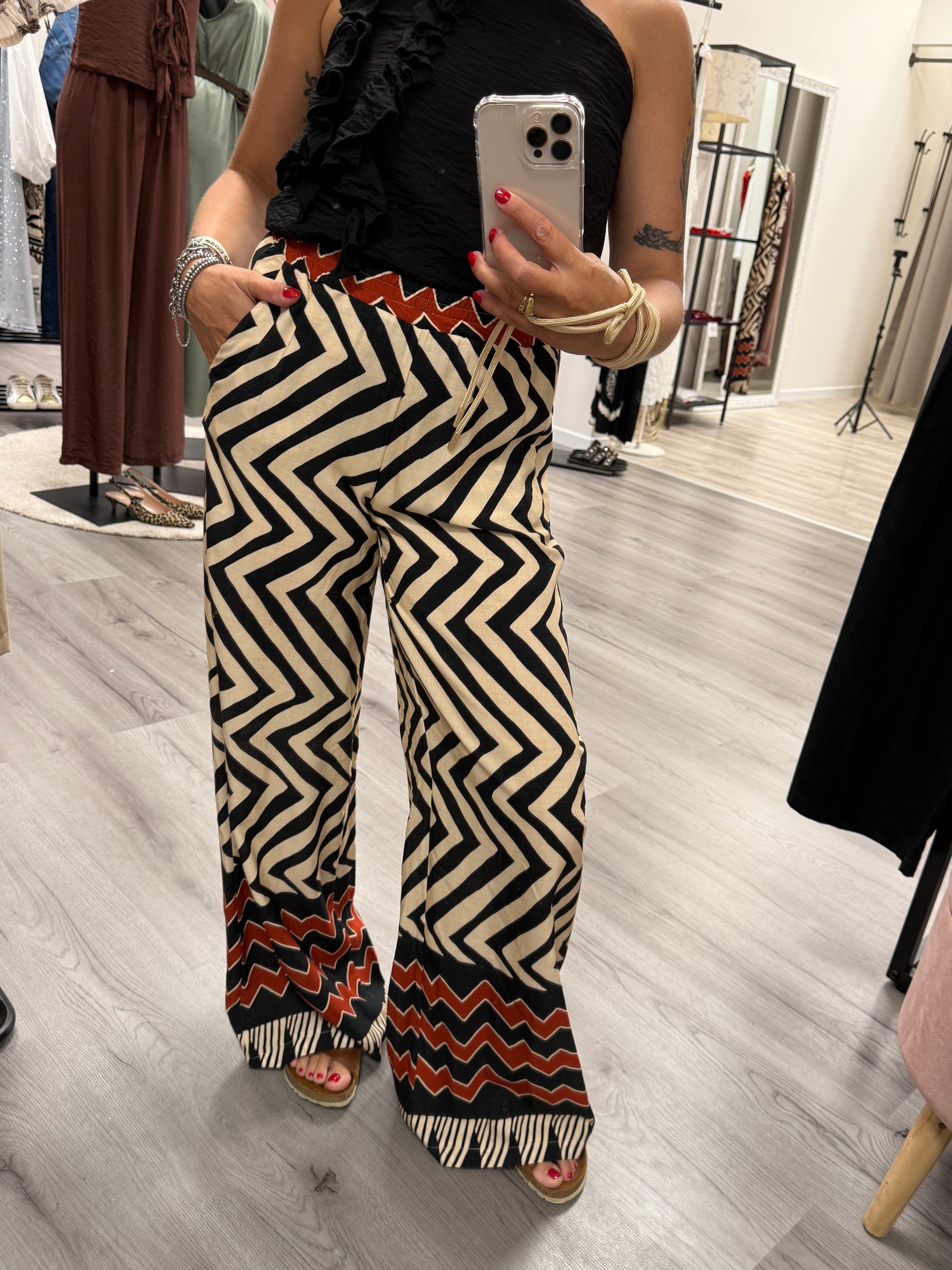 Pantalone fantasia etnica in 100% viscosa HaveOne nei toni del burro e nero con fascia India sul fondo tasche laterali elastico in vita fit morbido