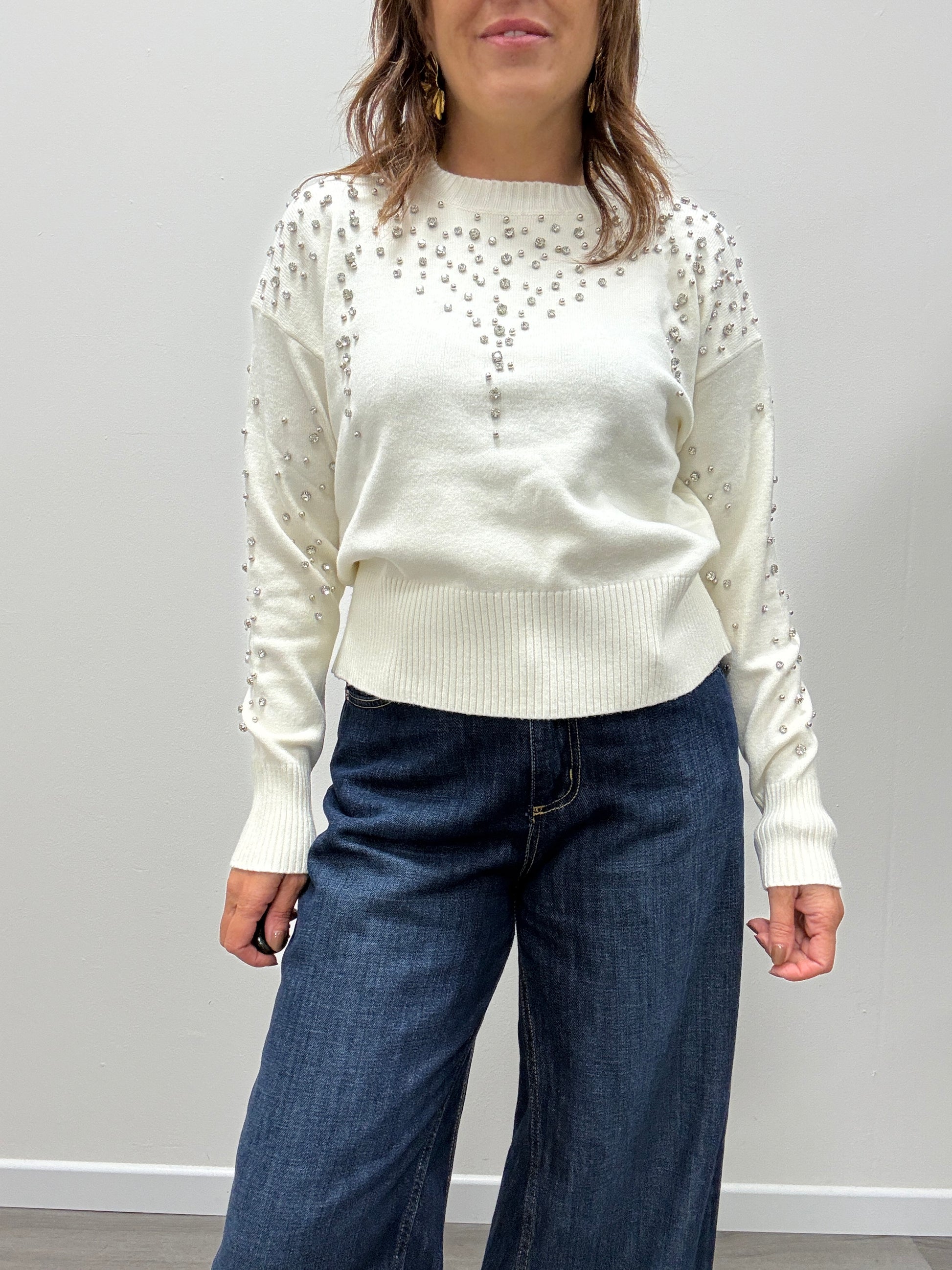 Maglioncino in viscosa morbidissima con strass e borchie argento applicati sul davanti e sulla manica.