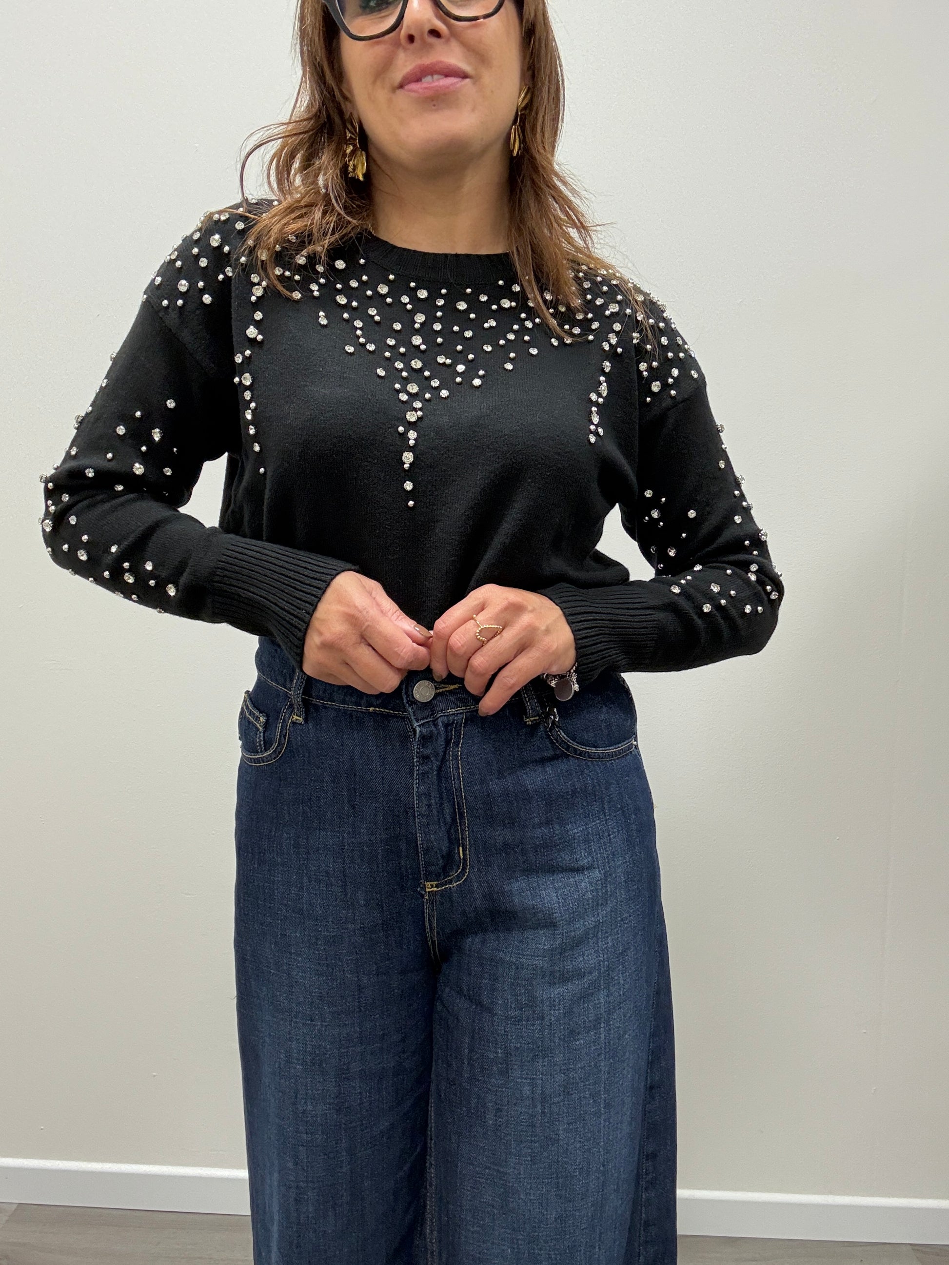 Maglioncino in viscosa morbidissima con strass e borchie argento applicati sul davanti e sulla manica.