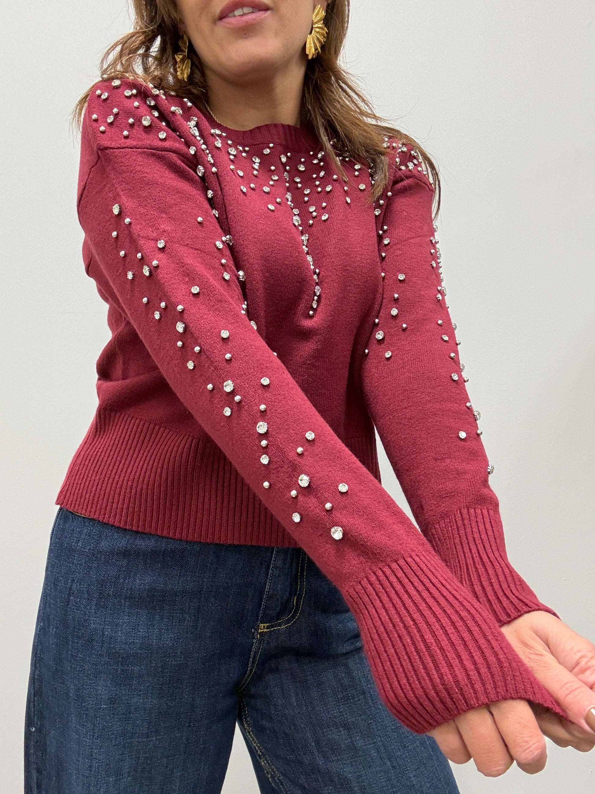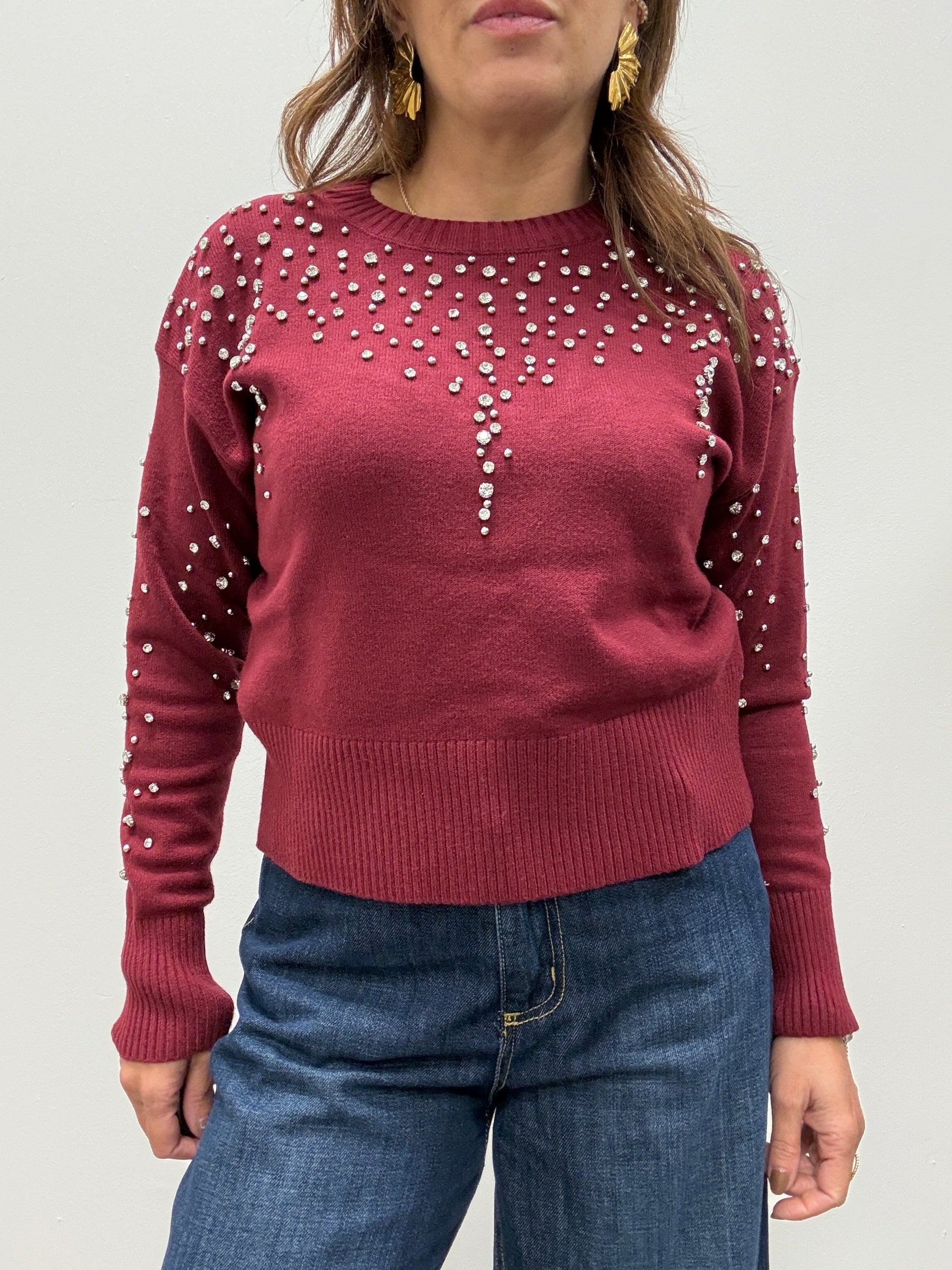 Maglioncino in viscosa morbidissima con strass e borchie argento applicati sul davanti e sulla manica.