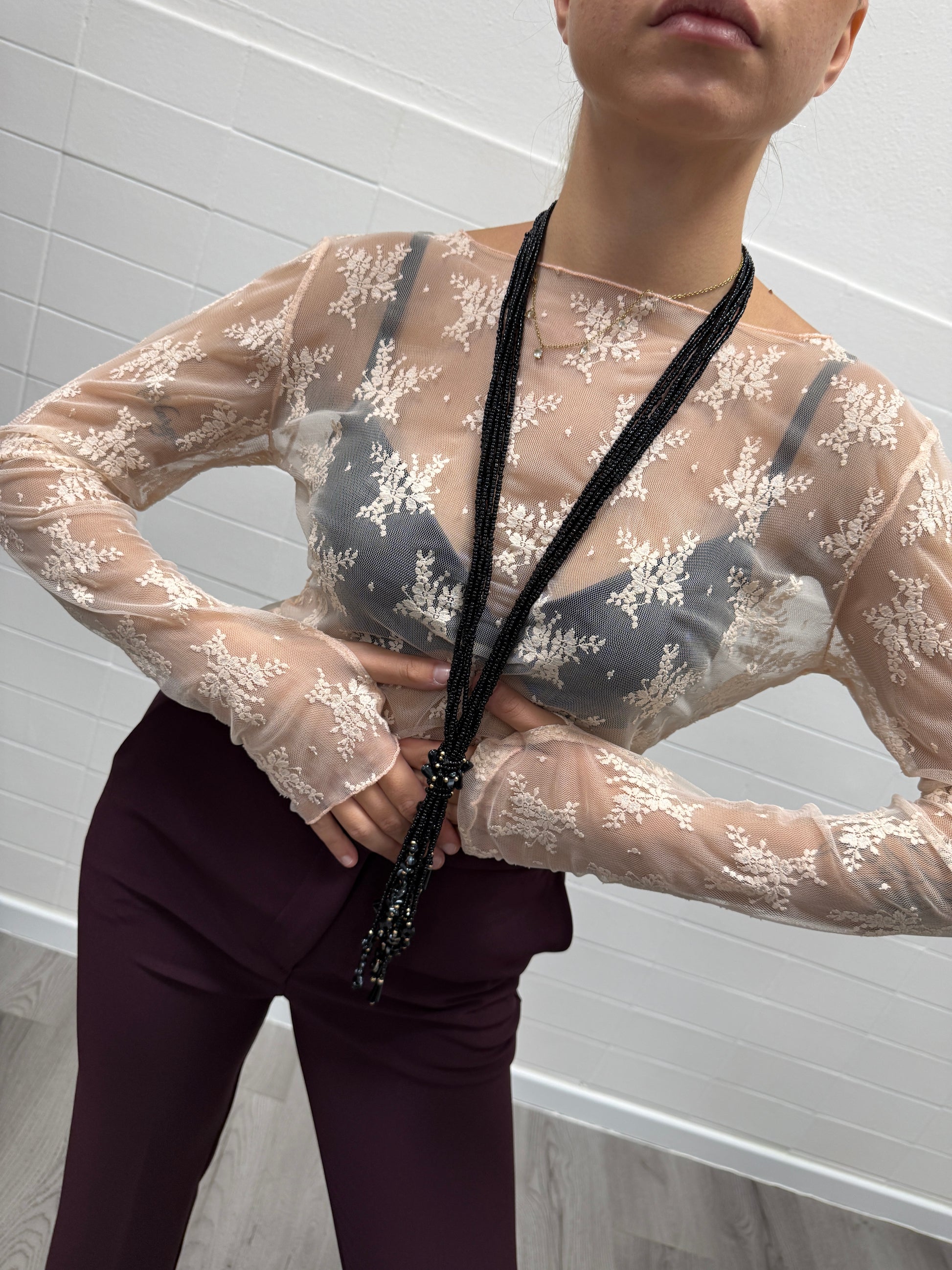 Top maglia paricollo in pizzo, modello della vestibilità Slim, Manica lunga, paricollo.