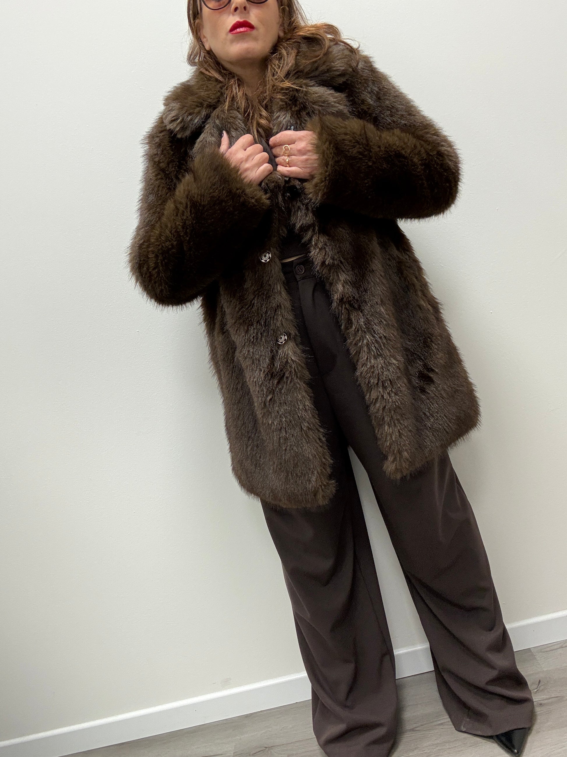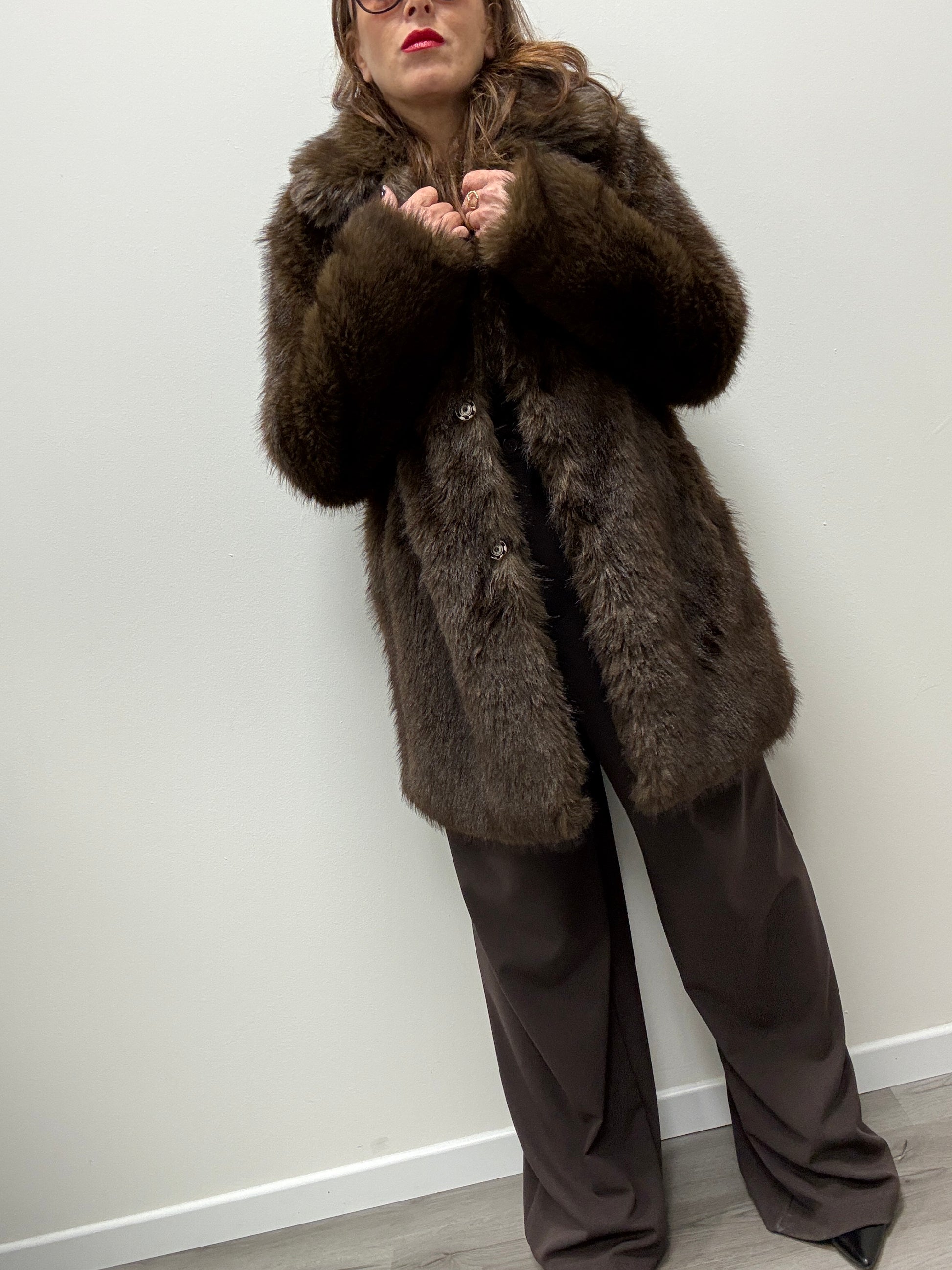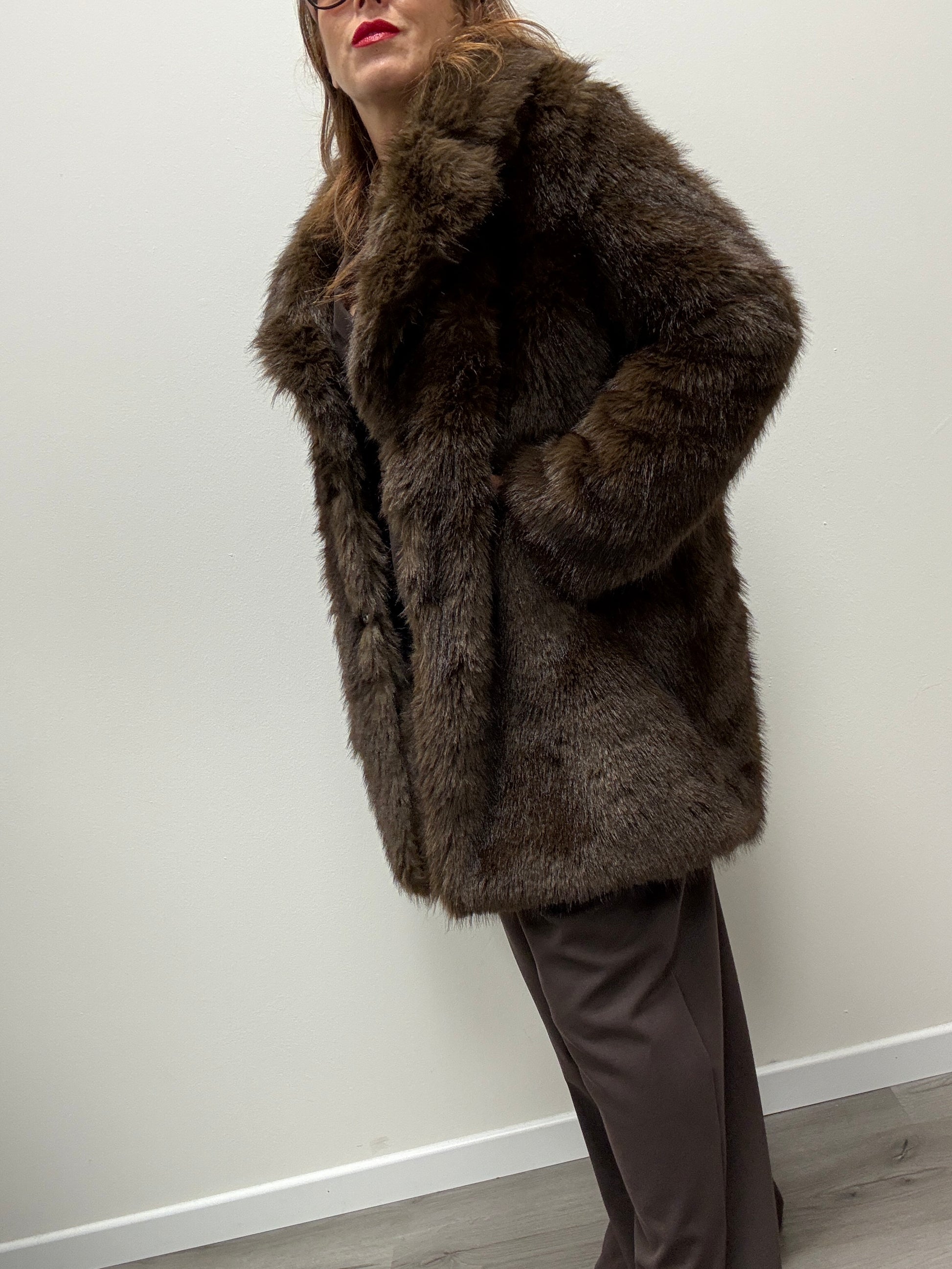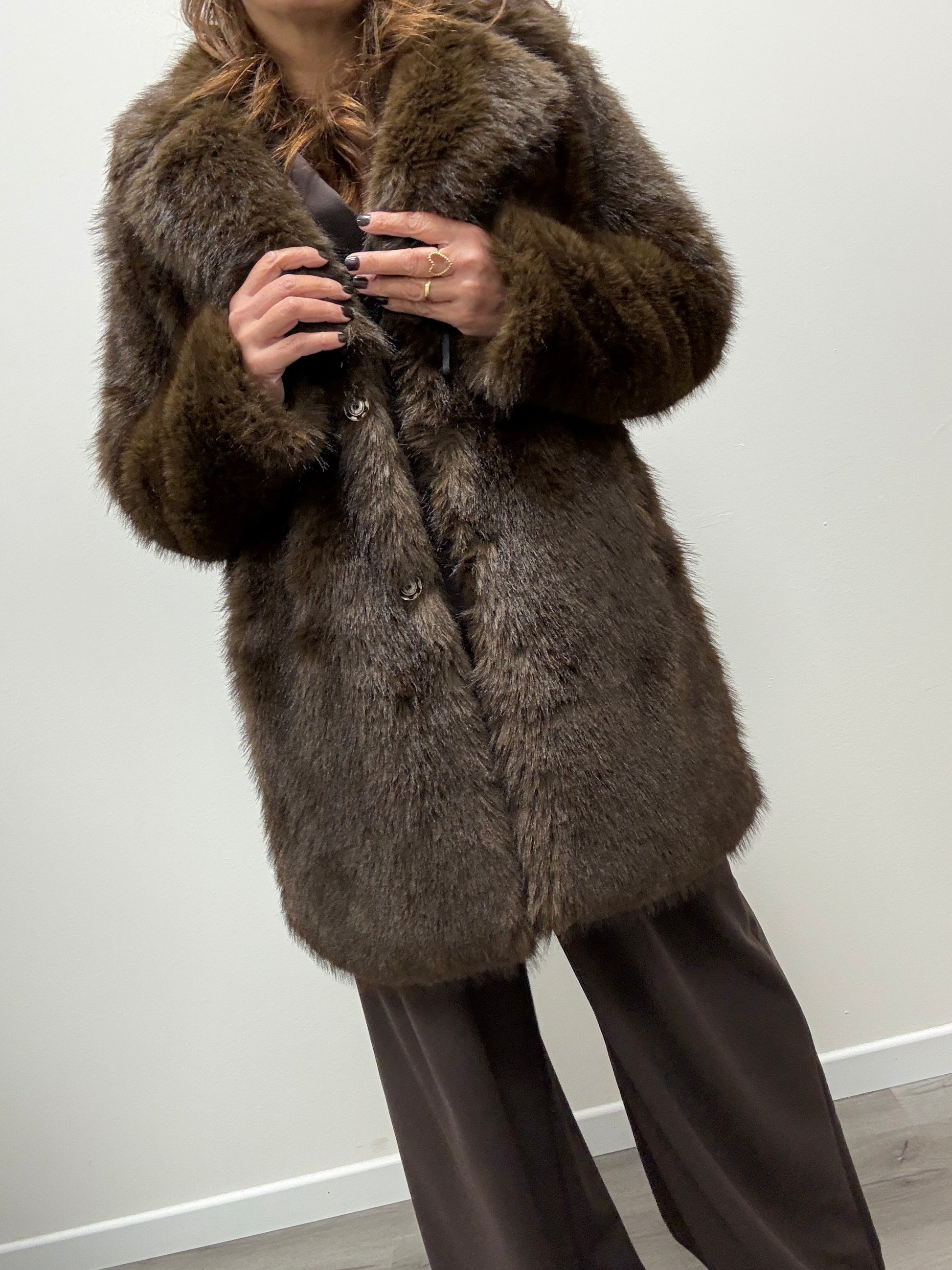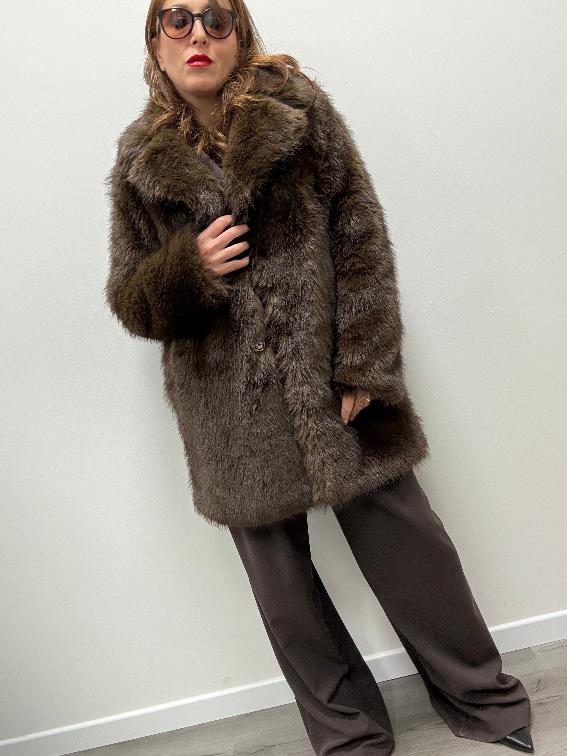 Pelliccia ecologica lunghezza midi con revere e tasche laterali. Chiusura con bottone automatico