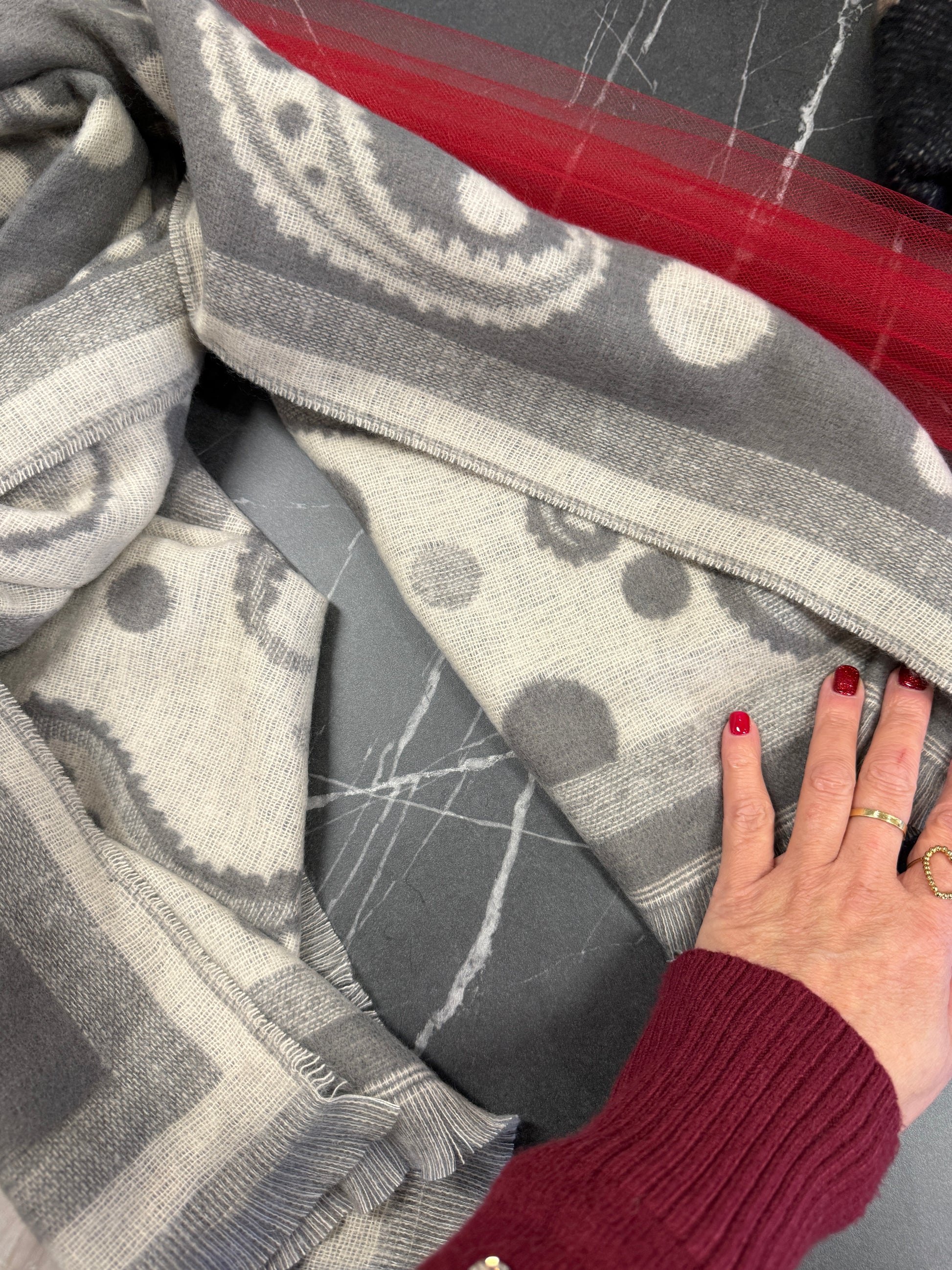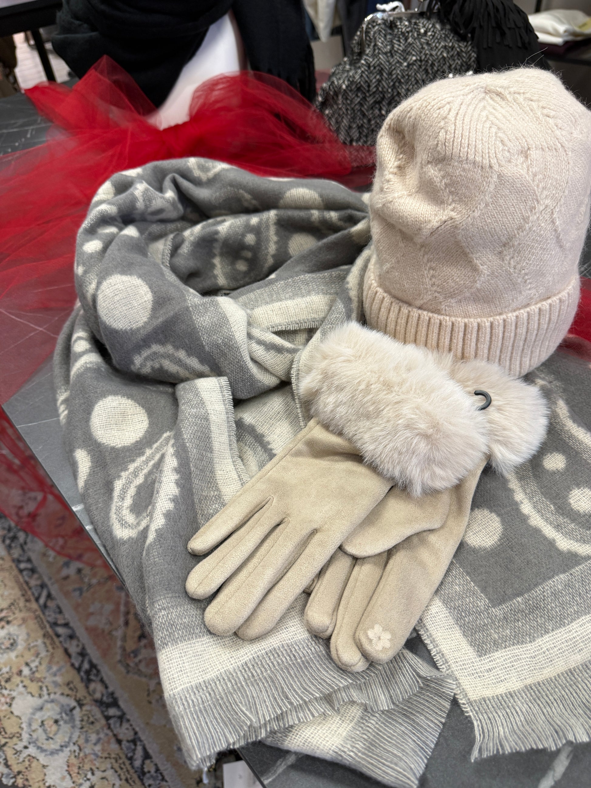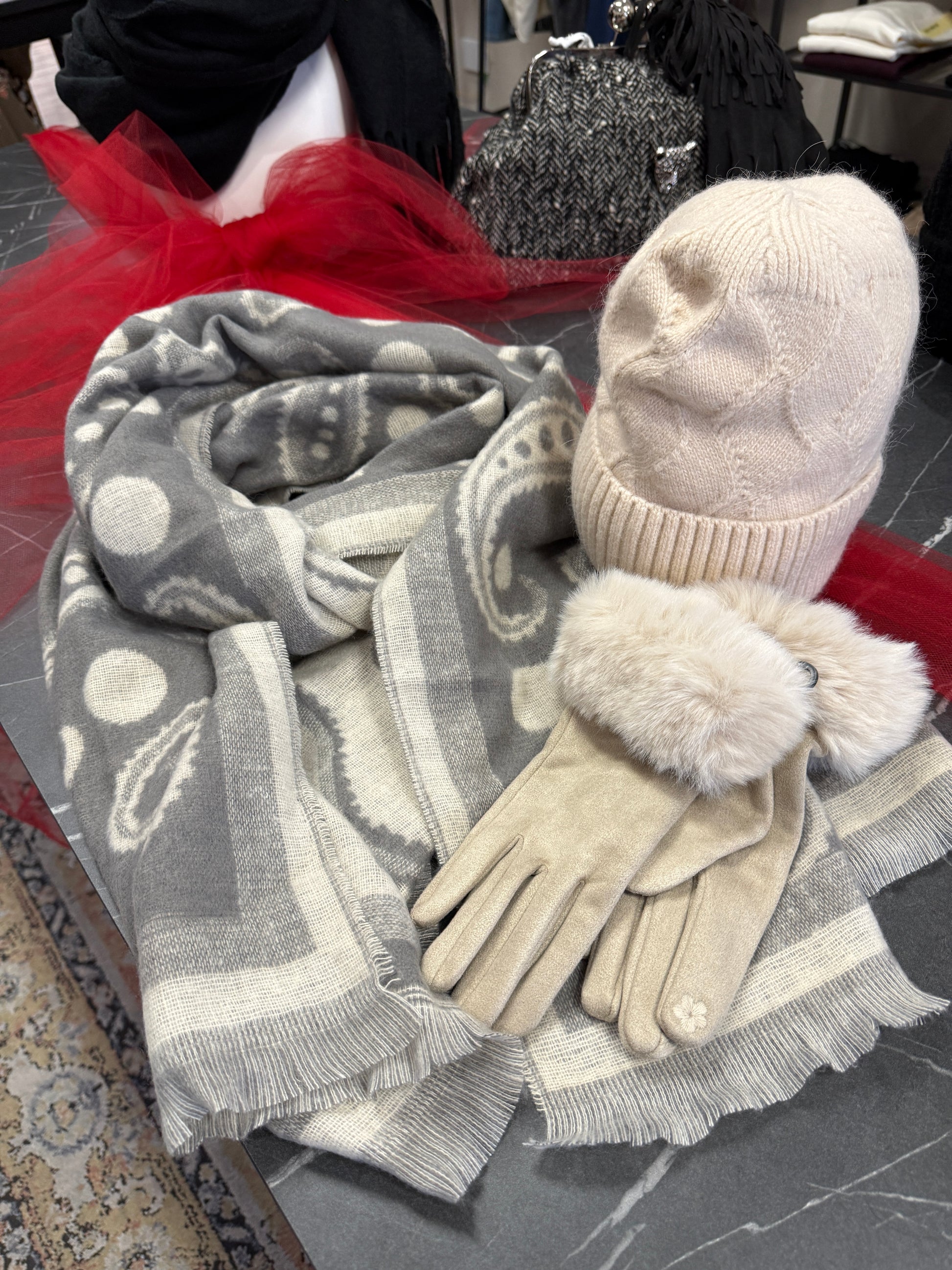 Sciarpa fantasia nei toni del burro e del grigio cappellino e guanti nei toni del burro.
