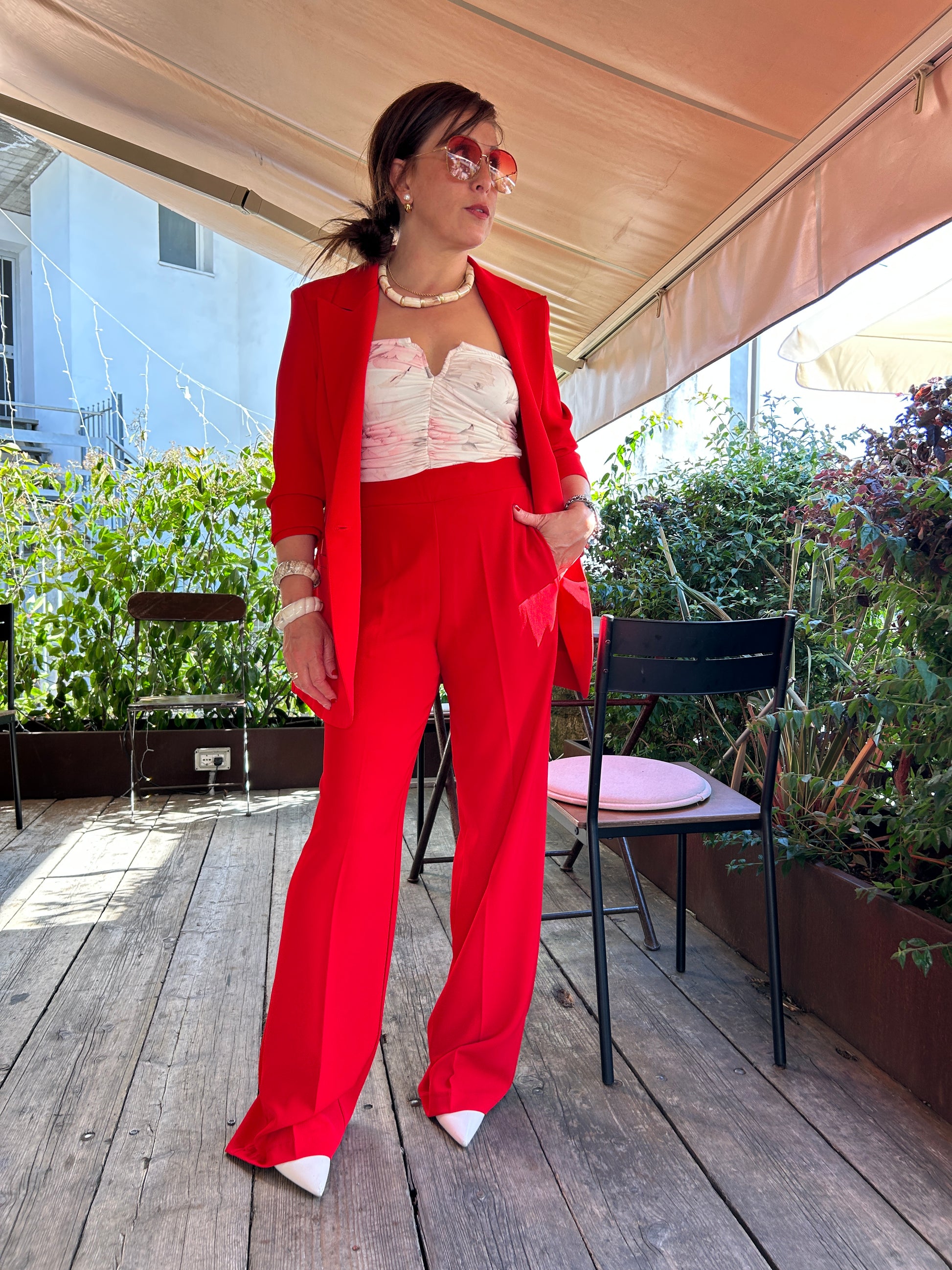 Giacca sfiancata, monopetto ad un bottone con spalline imbottite.